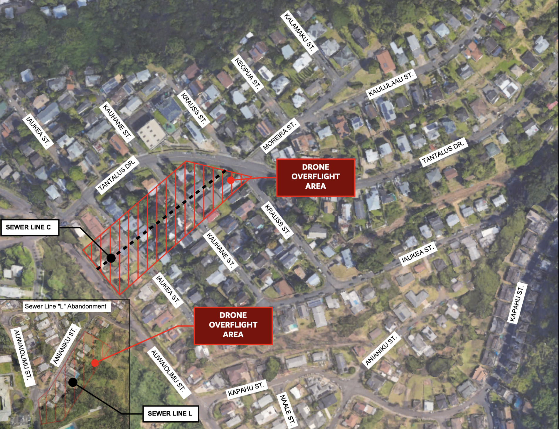 This is a notification that Department of Hawaiian Home Lands (DHHL) will be conducting a drone overflight of the general area, including easements, on March 4 to document existing project conditions in preparation for upcoming sewer work.