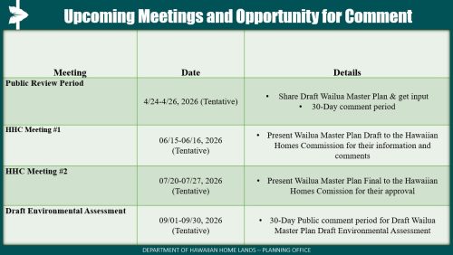 For more information, please contact Kialoa Mossman with DHHL’s Planning Office at [email protected] or via phone at (808) 730-0345.