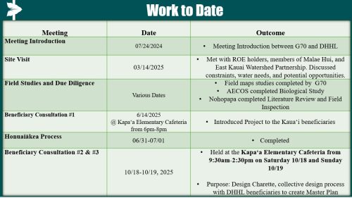 The Department of Hawaiian Home Lands (DHHL) is developing a master plan on its lands on Kauai in Wailua that in total comprise approximately 474 acres (also known as the Wailua DHHL Planning Area). These lands will primarily be planned for subsistence agricultural homestead lots, possibly some residential homestead lots, and other associated land uses. The project will also include completion of the state environmental review process under Hawai‘i Revised Statutes, Chapter 343 and Hawai‘i Administrative Rules, Chapter 11-200.1. For DHHL to provide homesteads in Wailua Planning Area, the department seeks to work with DHHL beneficiaries in the creation of the Wailua master plan by engaging in all a series of future consultation meetings and comment periods associated with this project. The beneficiary consultation meeting schedule is below.