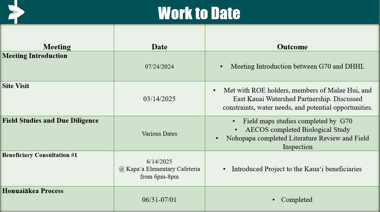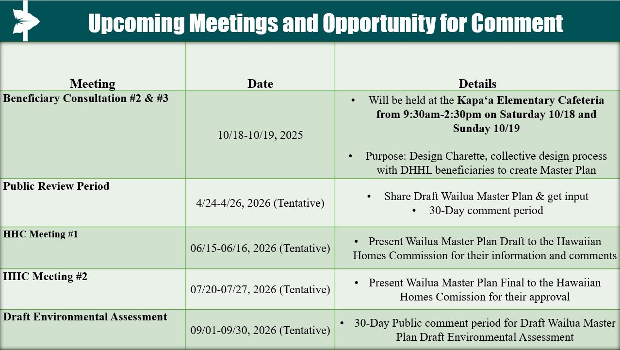 The Department of Hawaiian Home Lands (DHHL) is developing a master plan on its lands on Kauai in Wailua that in total comprise approximately 474 acres (also known as the Wailua DHHL Planning Area). These lands will primarily be planned for subsistence agricultural homestead lots, possibly some residential homestead lots, and other associated land uses. The project will also include completion of the state environmental review process under Hawai‘i Revised Statutes, Chapter 343 and Hawai‘i Administrative Rules, Chapter 11-200.1. For DHHL to provide homesteads in Wailua Planning Area, the department seeks to work with DHHL beneficiaries in the creation of the Wailua master plan by engaging in all a series of future consultation meetings and comment periods associated with this project. The beneficiary consultation meeting schedule is below.
